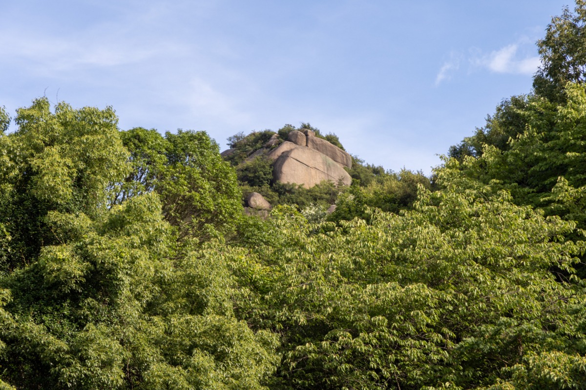 仏舎利塔のある場所から山の上を見上げると、大きな奇岩の姿を見ることができます。