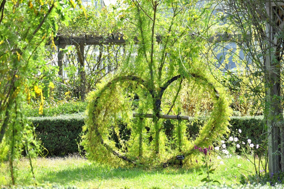 印象的なガボゼのすぐそばに、緑のハート型オブジェがそっとたたずんでいます。しっとりお散歩の後は、本日のコーヒー1杯無料という園内の「AKAiiWA農カフェ」へ。県内では2台しかない「魅せる焙煎機」で焙煎したての一杯をぜひ味わって。