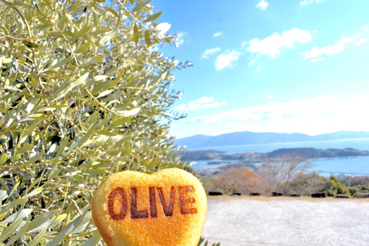 オリーブ園のショップ限定のケーキです。園内のオリーブの木に、細長いハート型になった葉を見つけられたらハッピー倍増?!「冬は空気が澄んで見晴らし最高。海面もキラキラ輝いておススメだよ」とは地元の方情報です。