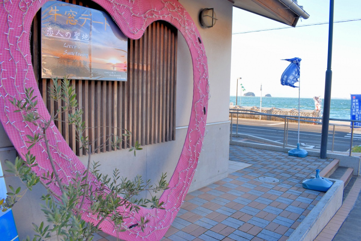 牛窓の人気イベント「牛窓デート」にちなんだフォトスポットは観光センター前です。近くのホテルではクリスマスと大晦日のカウントダウンに花火も上がりますよ。夜の牛窓も注目です。