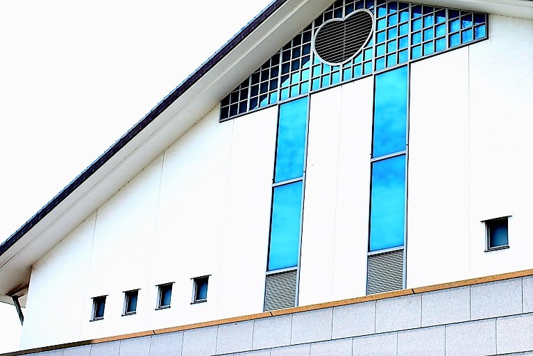 早島町の町民総合施設の窓がかわいいハート型。さすが町への結婚定住を支援する早島町ならではのデザインです。向かいの町役場で婚姻届けをもらうと末永く幸せがつづきそうですね。