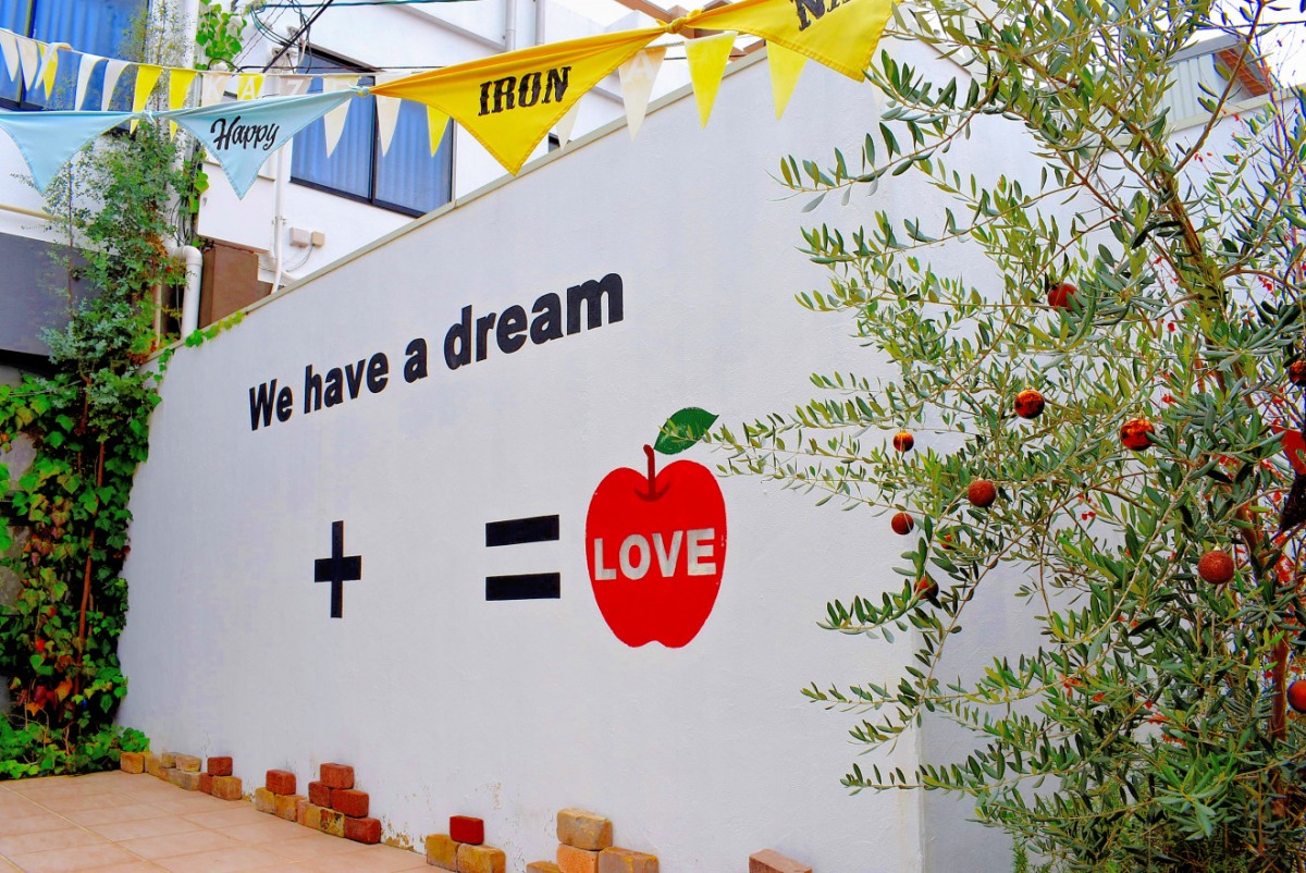 色鮮やかでおいしいランチやデザートをいただいた後は中庭へ。こちらも問屋町で人気を博した「壁」です。おっと、ハート型かと思いきやりんご型!!どちらも愛がいっぱいこもっています。