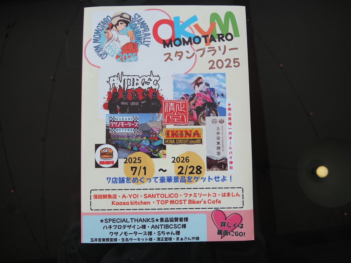 岡山県内にはライダーが営む魅力的なお店が点在し、お店同士の繋がりから生まれるユニークなイベントがライダーたちを惹きつけています。今回ピックアップするのは、岡山市の「TOP MOST Biker's Cafe」が5周年を記念して主催する「OKYM MOMOTARO STAMP RALLY 2025」。