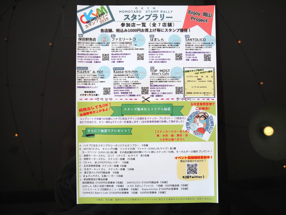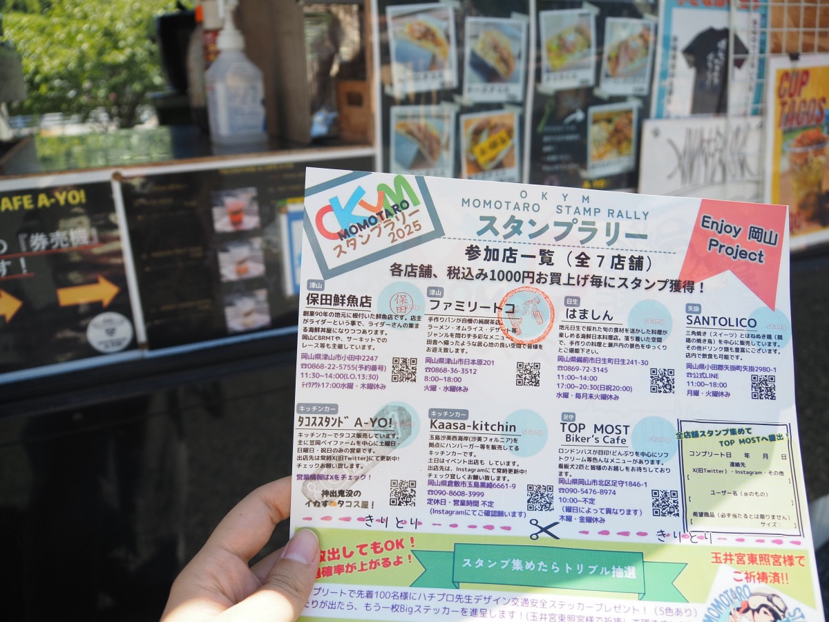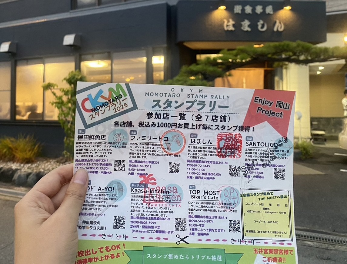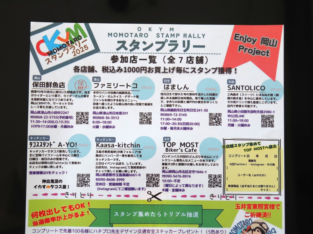「OKYM MOMOTARO STAMP RALLY 2025」は、岡山県内のライダーが営むお店をめぐるスタンプラリー。7店舗すべてを訪れ、買い物や飲食をすると抽選に参加できます。