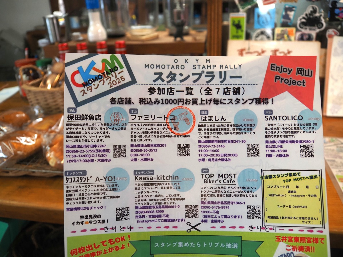 各店舗で1,000円以上の飲食または買い物をするとスタンプが1つもらえ、7店全部のスタンプを集めたら、台紙に必要事項を記入。主催店である岡山市の「TOP MOST Biker's Cafe」に提出して完了となります(基本は「TOP MOST Biker's Cafe」に直接提出。遠方の方のみ郵送可)。