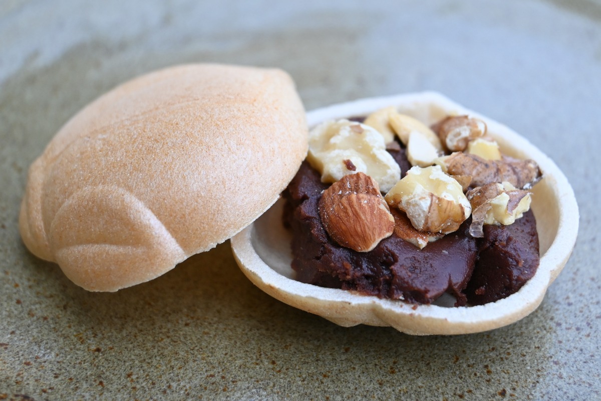 チョコレート専門店「@alfer」とコラボ開発したあんチョコペーストとナッツを挟んだ「もなか」も好評です。藤戸まんぢゅう伝統のこしあんを挟んだタイプもあり、どちらもおすすめです。