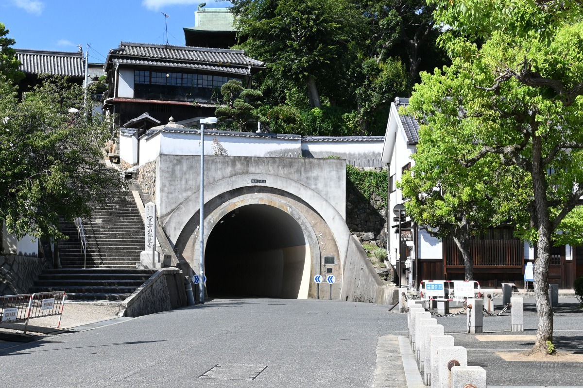 1927年、当時皇太子であった昭和天皇の行啓記念に建設された、鶴形山西部・観龍寺の鐘楼の真下を南北に抜けるトンネルです。