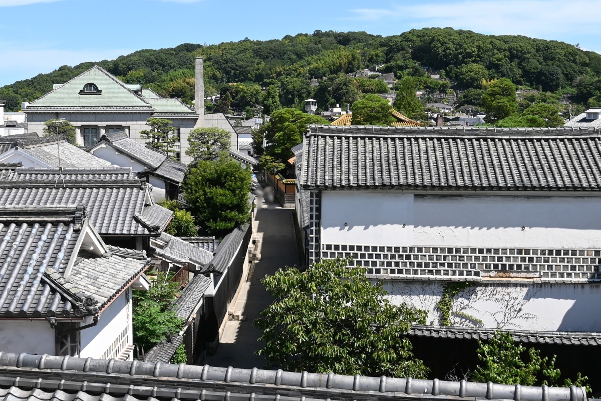 映画のタイトルバック、倉敷川方面に向けて屋根が重なる象徴的な景色は「本町通りの宿」から撮影されたものです。