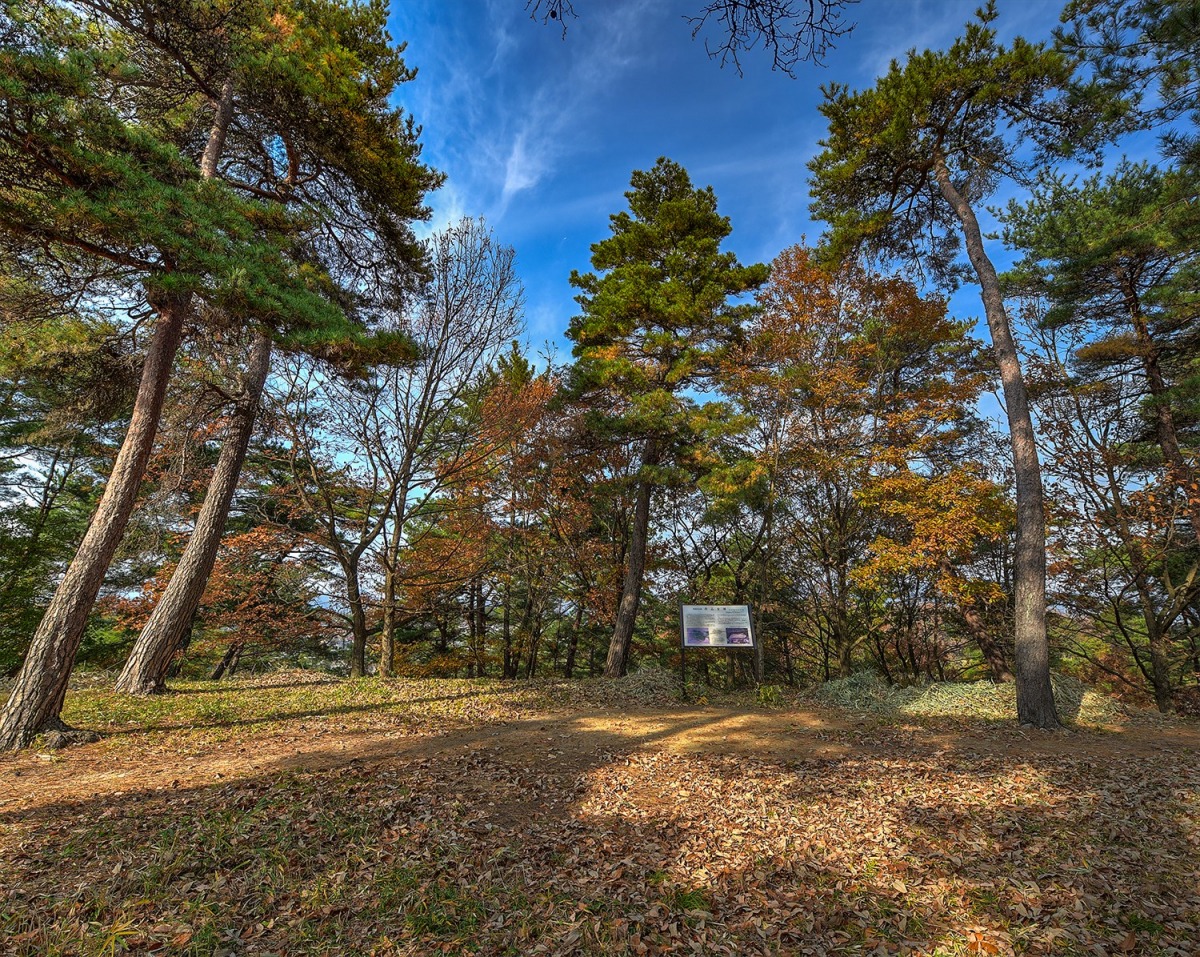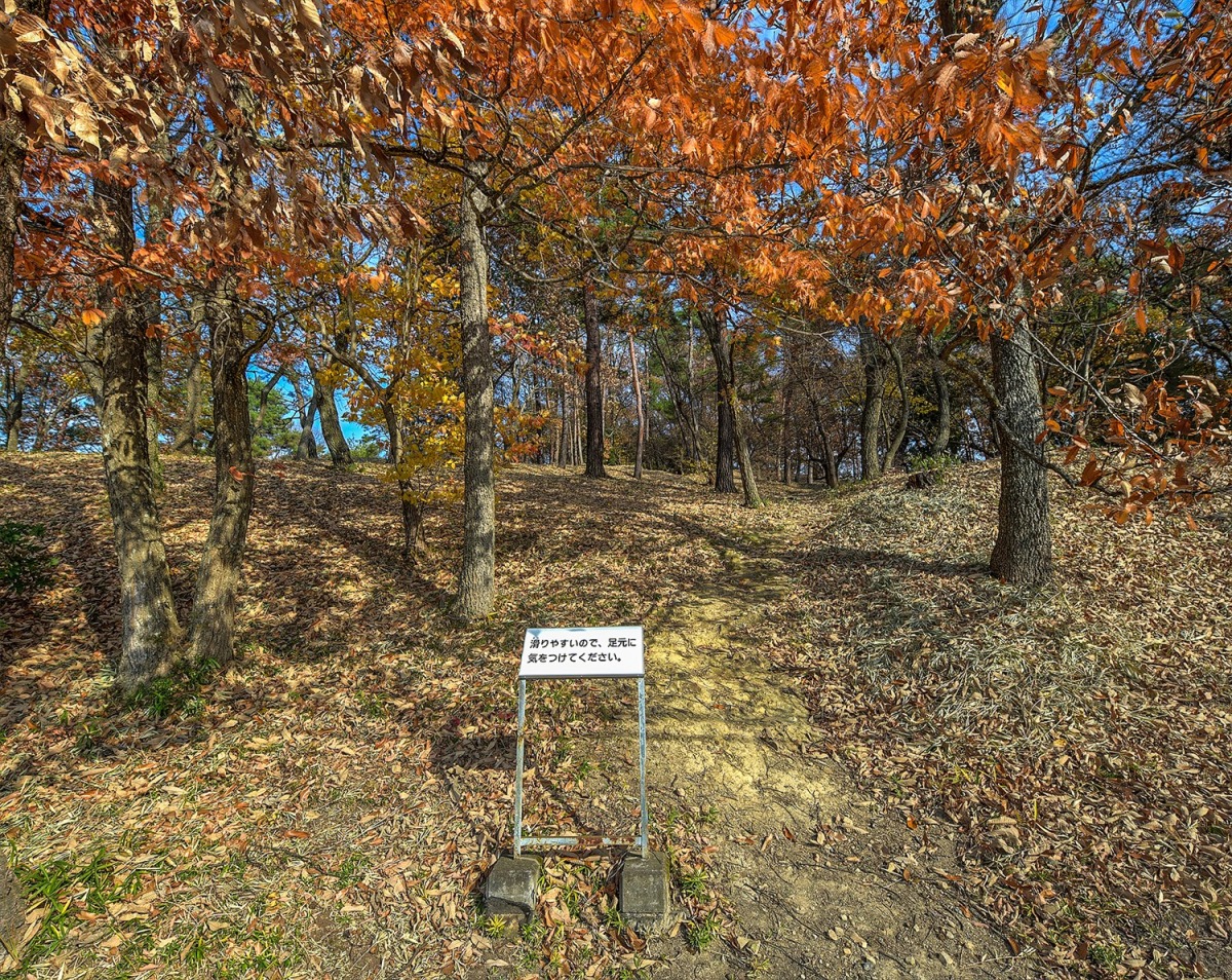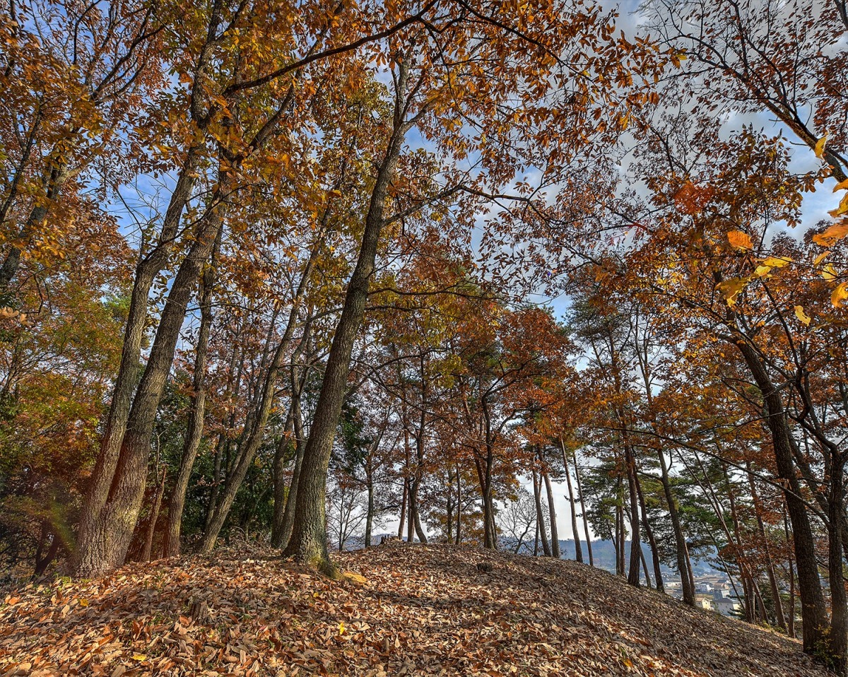 前方後円墳の「前方部頂上」付近の風景です。 晴天の日、落葉樹・常緑樹からの木洩れ日が、落ち葉に当たり美しいです。