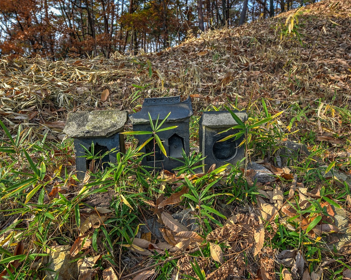 作山古墳は、前方部・後円部ともに三段築城された前方後円墳です。 私は、二段目もぐるりと歩いて散策しました。 この写真のような祠(ほこら)が二か所にありました。 古くから地元の方々のお祈りの場所だろうと思いました。