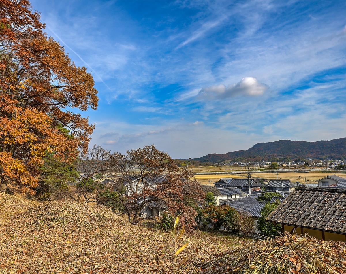 落ち葉を踏みしめながら、更に進むと、紅葉した木々・柿の木・遠くに備中国分寺が見える場所に出会いました。 初冬の吉備路らしい風景です。