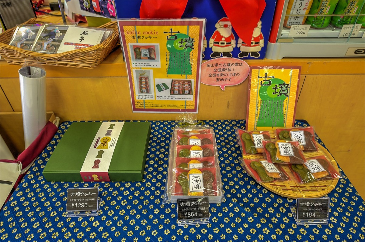 前方後円墳の形をした古墳クッキーができました。 岡山県産のでぇーれぇー粉、京都宇治産の抹茶などのこだわりの材料で作られており、添加物は使用していないそうです。