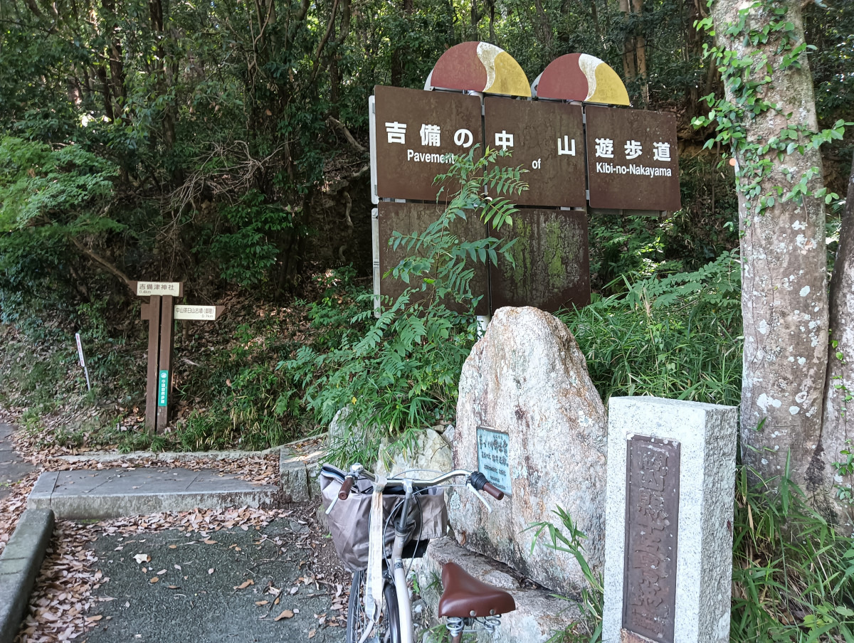 JR備前一宮駅前から、まずは「吉備津神社」へ向かいます。吉備津神社側から吉備の中山に登るために! 距離は約2.5km。約10分。登山道の前に自転車を置いていざスタート。