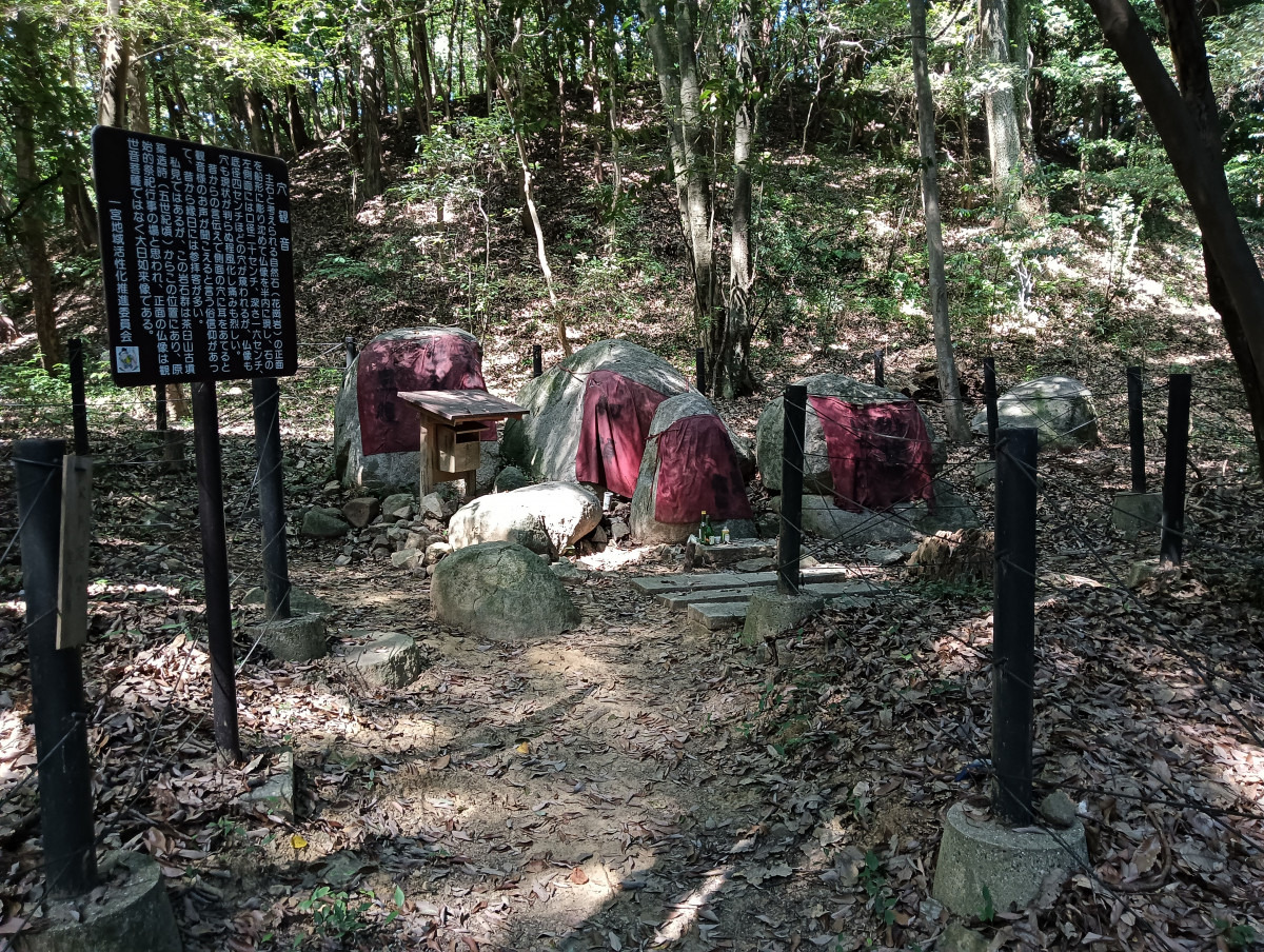 「中山茶臼山古墳」から徒歩約5分の場所には、「穴観音」と呼ばれる数個の自然石があります。中央の石に観音像が彫られており、側面に穴が開いていることが名前の由来となっているそうです。観音様の正面に立つと見えるのが、「中山茶臼山古墳」の頂部であり、そのことから「穴観音」は古墳の埋葬者を拝むときの磐座(いわくら:神が座るとされる聖なる石)だったのではと言われています。