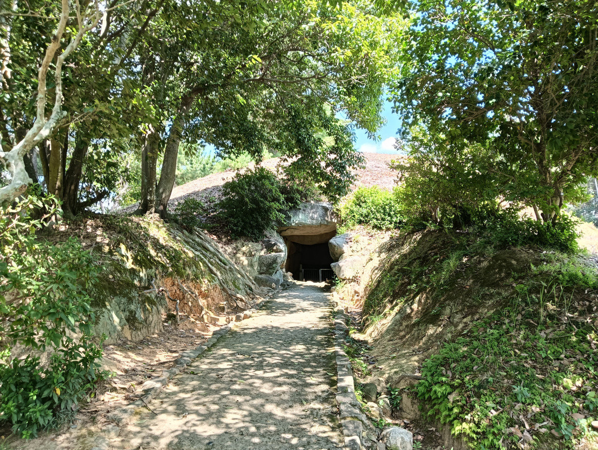 古墳と言えば、パックリ口を開いた石室の入り口も気になりますよね。「千足古墳」から約3km、約20分で「こうもり塚古墳」に着きます。6世紀に作られた全長約100mの前方後円墳で、巨大な横穴式石室があります。石室の中央には石灰岩の一枚岩をくり抜いて造った石棺が安置されています。入り口付近までしか入れませんが、石室のひんやりとした空気を感じることができます。もし石室の中まで入りたいなら、個人的には「牟佐大塚古墳」をおススメします。吉備路とはかなり離れているので今回はご紹介しませんが、ご興味ある方は是非足をお運びください。