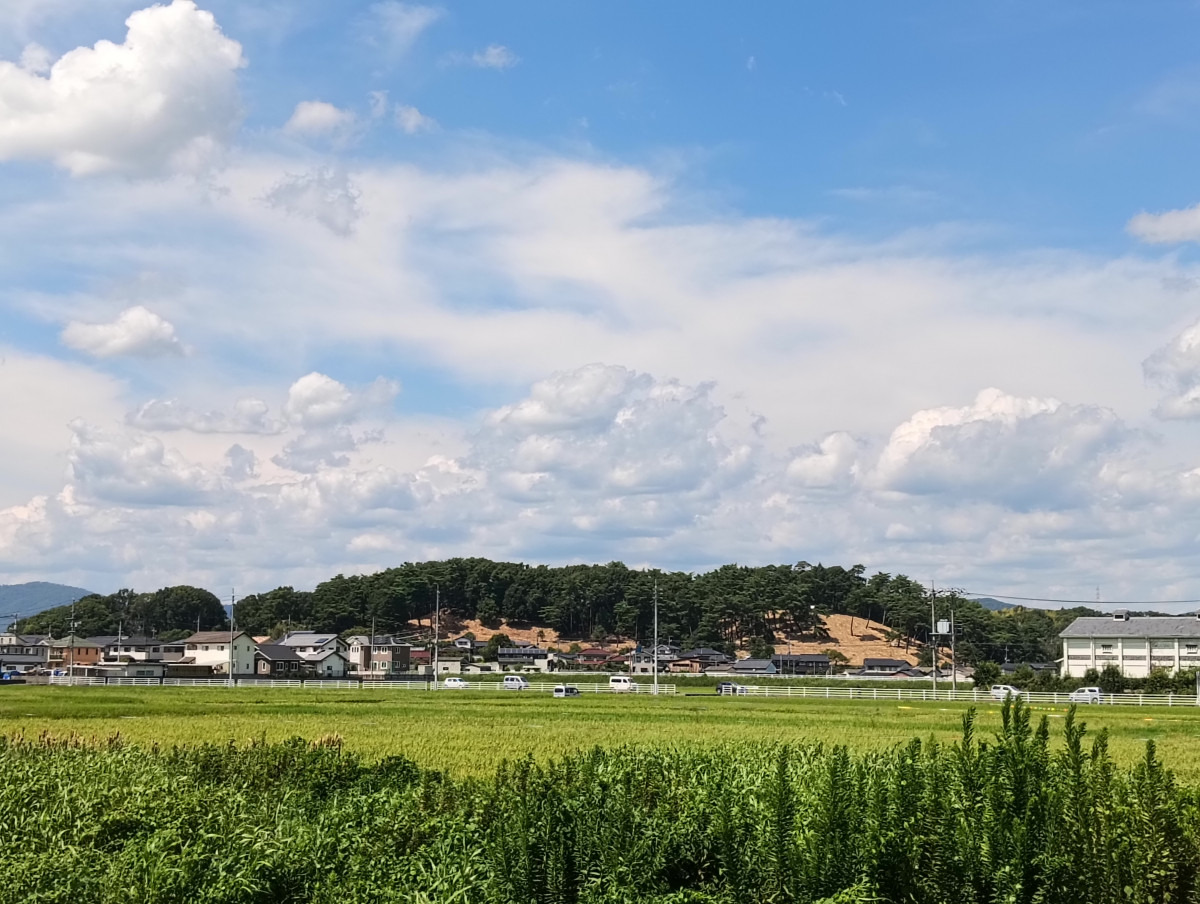 岡山県では最大規模の「造山古墳」のそばにある6つの陪塚(ばいちょう)の1つで、第五号古墳とも呼ばれます。「陪塚」とは大型の古墳に近接する小規模の古墳の事です。初めて遠くから見たときは感動しました。古墳の上は長い年月を経て、林のようになっていることが多いため、なかなかあの形でイメージしづらいんですよね。近くまで行って上からの景色を眺めるのもおススメですが、やはり遠くからあの独特の形状も楽しみたいですよね。写真は「造山古墳」の上から「千足古墳」を眺めたもの。