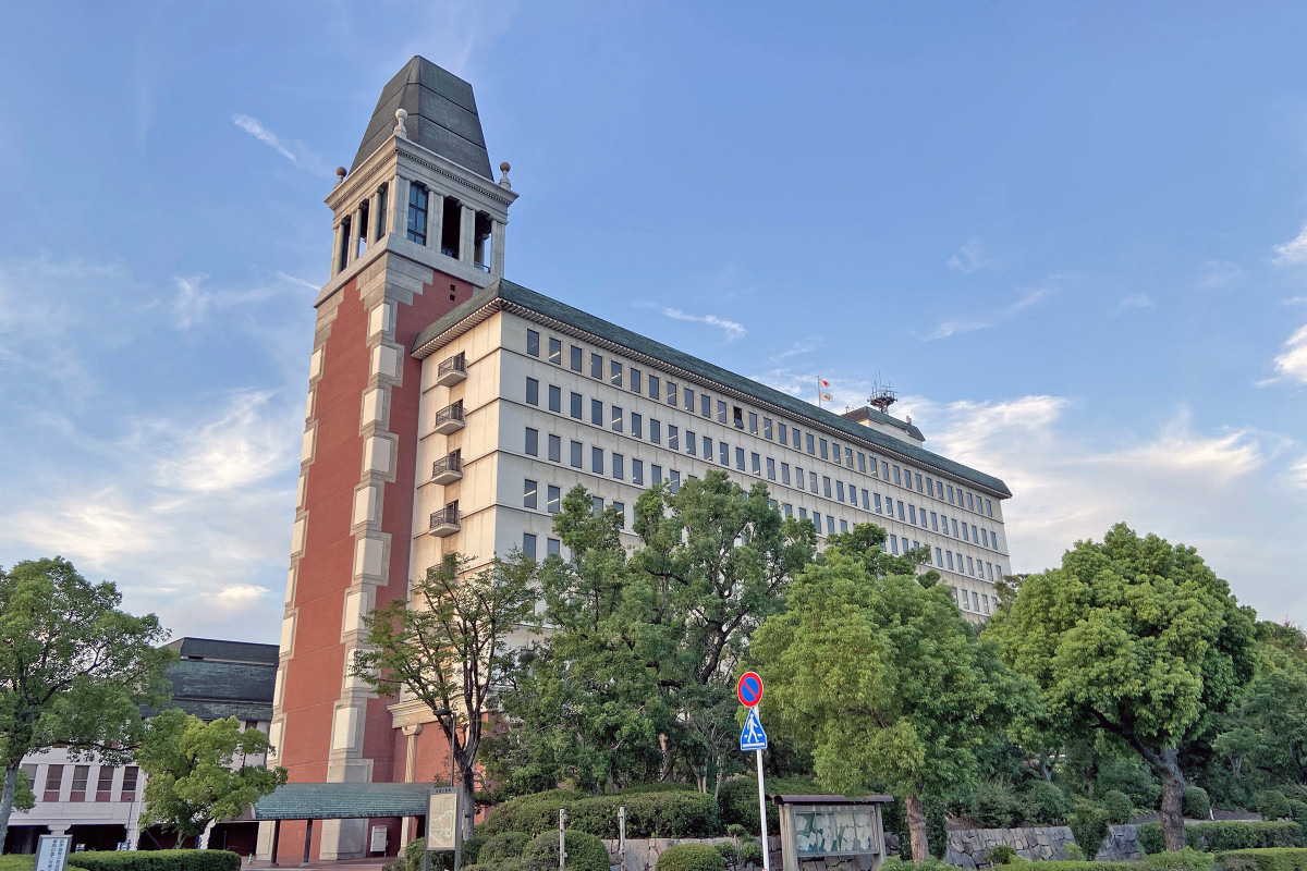 遠くからも認識できるシンボルタワーが目印の市役所本庁舎。白壁の町並みに調和するようデザインされ1980年に完成しました。