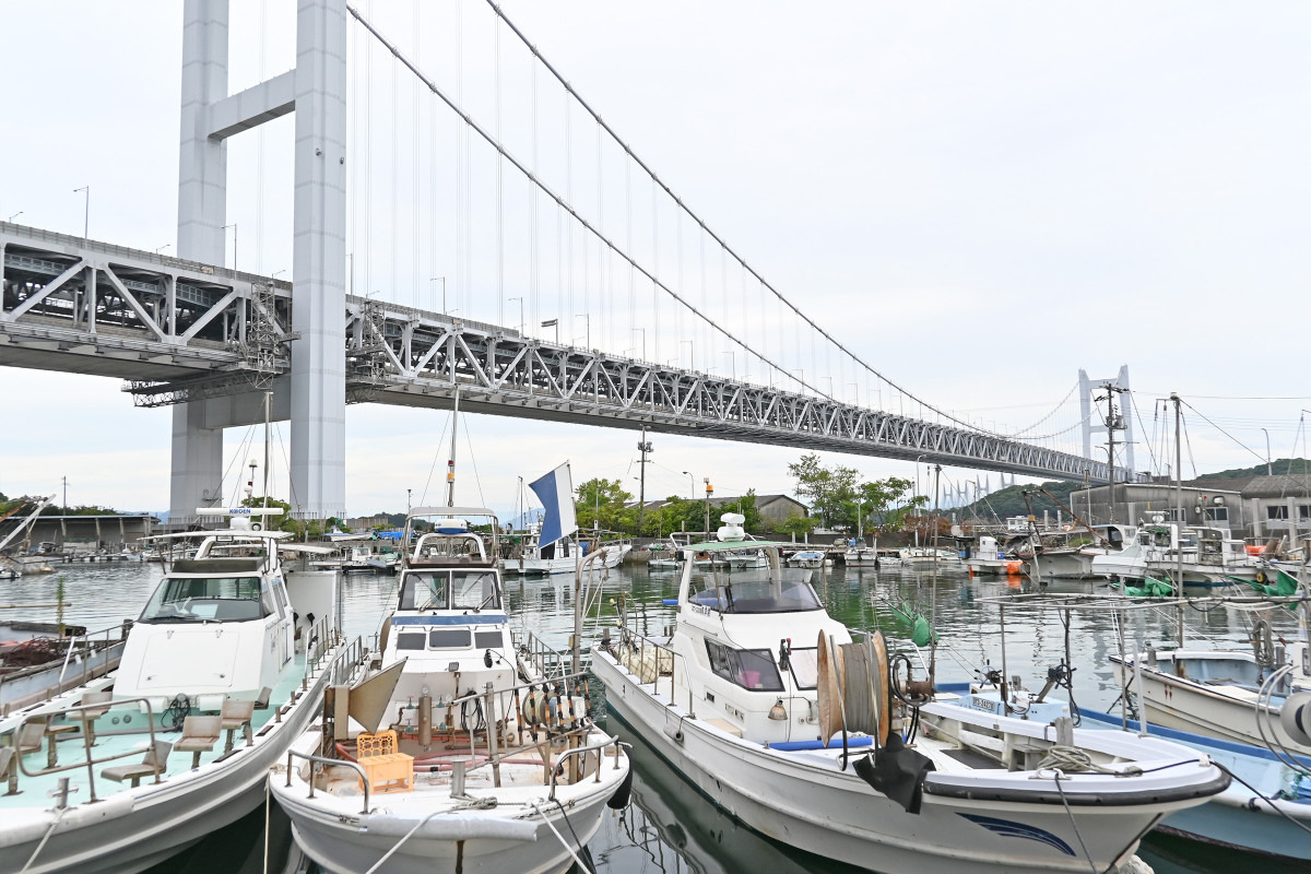 瀬戸大橋を見上げる下津井港は、江戸時代に風待ち潮待ちの港として、香川県の丸亀と連絡する琴平参詣船の発着港、北前船や参勤交代の御座船の寄港地として栄えました。現在も瀬戸内海有数の漁港として活躍しています。