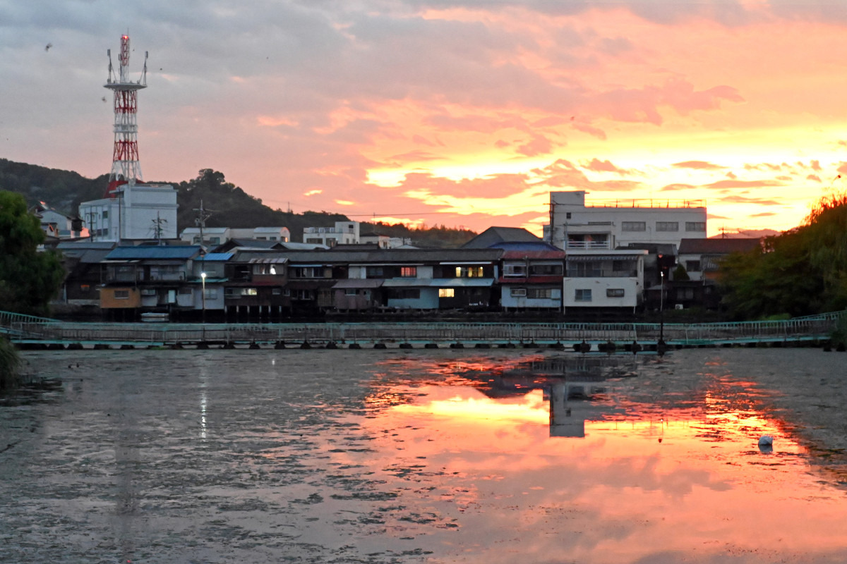 絵になるドラム缶橋は『蔵のある街』を含め、多くの映画やドラマのロケ地としても知られています。日中の明るい景色もいいですが、夕景もおすすめです。