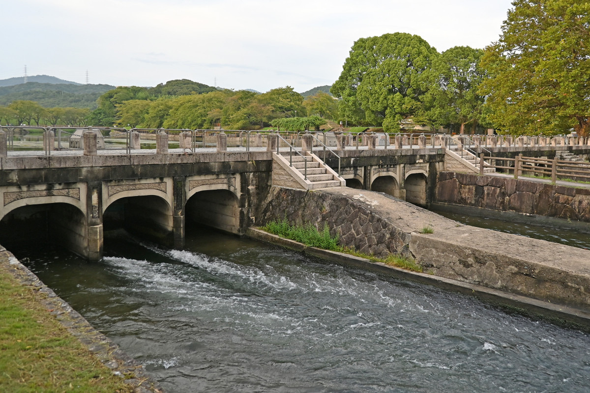 市民の憩いスポット「酒津公園」に隣接した、国指定重要文化財・日本最大級の樋門。