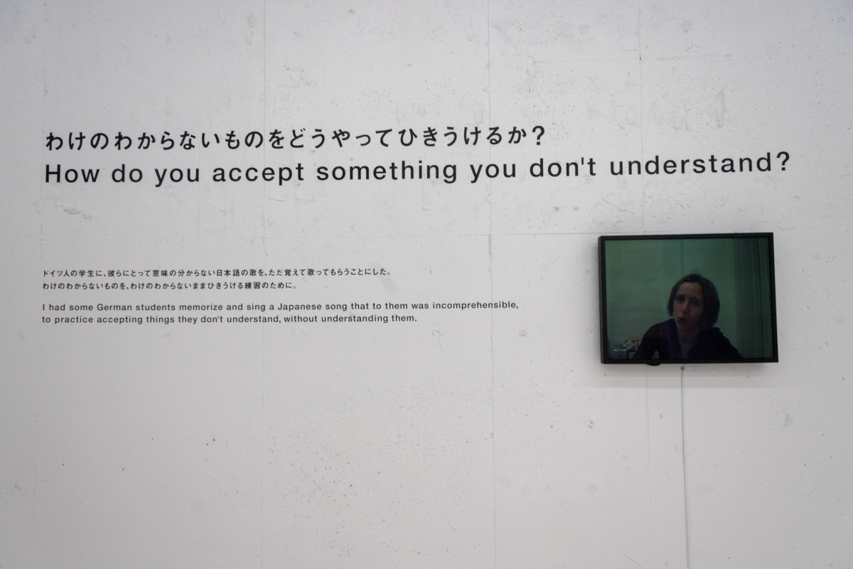 こちらの作品は、ドイツ人の女性が日本の歌を歌っているムービーが延々と流れるもので、(意味がわからない日本語の歌詞を、聞いたままで歌うことで)知らないものを知らないまま受け入れることを表しています。