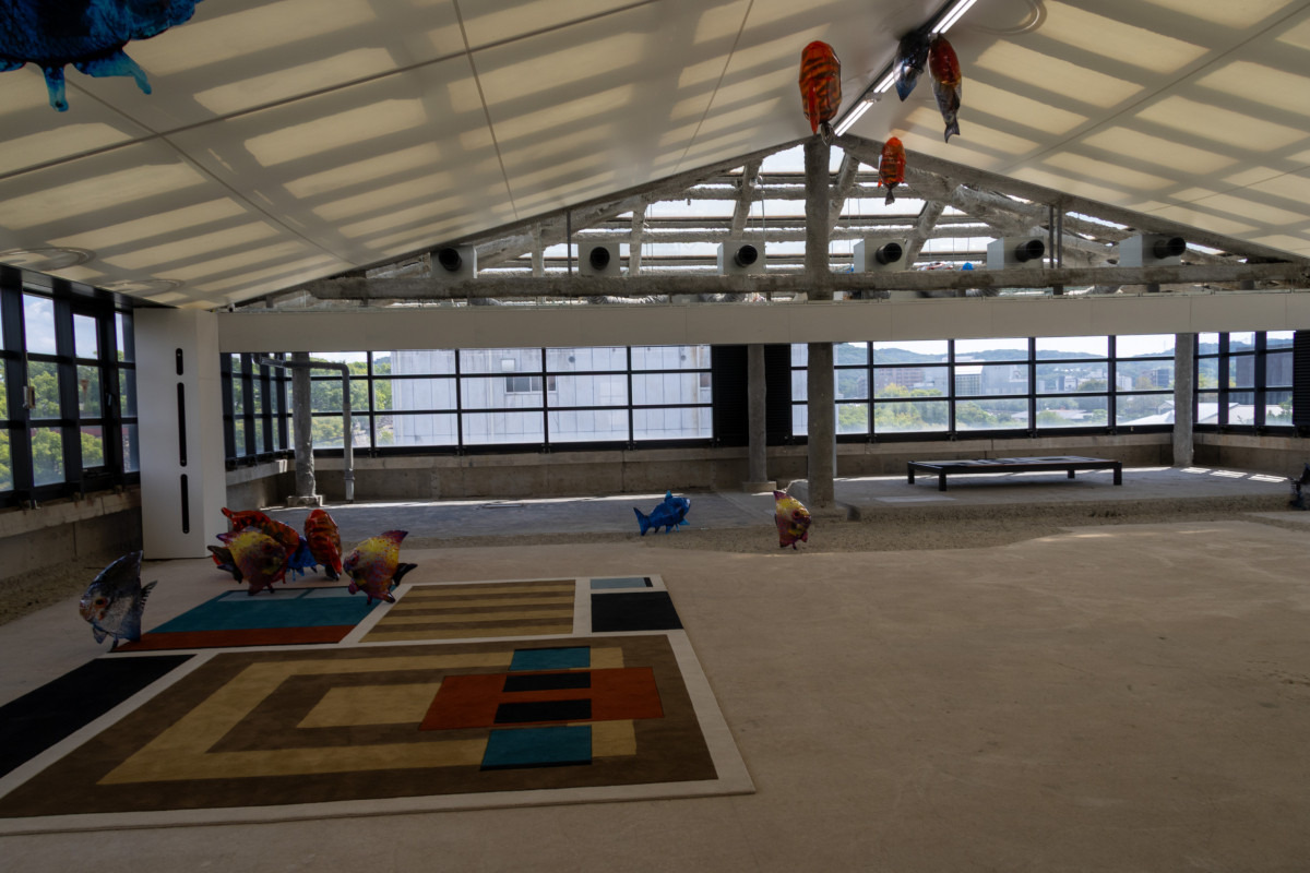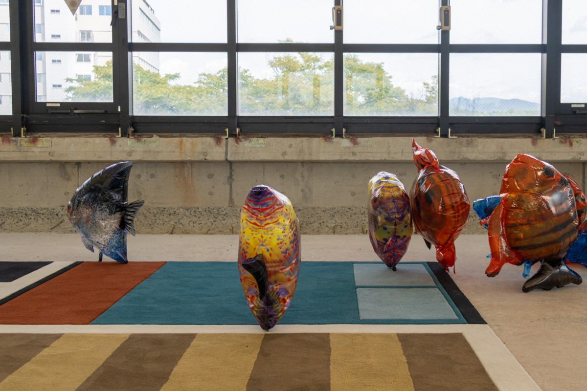 開放的な空間のなかを泳ぐ無数の魚型バルーンが印象的なこちらの作品は、エントランスにも作品を設置しているフィリップ・パレーノ氏によるものです。