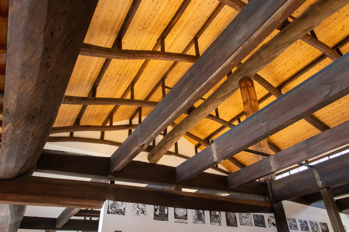 主屋のエントランスを入ると、右奥にギャラリーがあります。こちらは改修時に元々あった2階の床を抜いて、天井の梁がみえるようになっていますので、現在では入手が困難な立派な木材を使った梁にも注目してみてください。