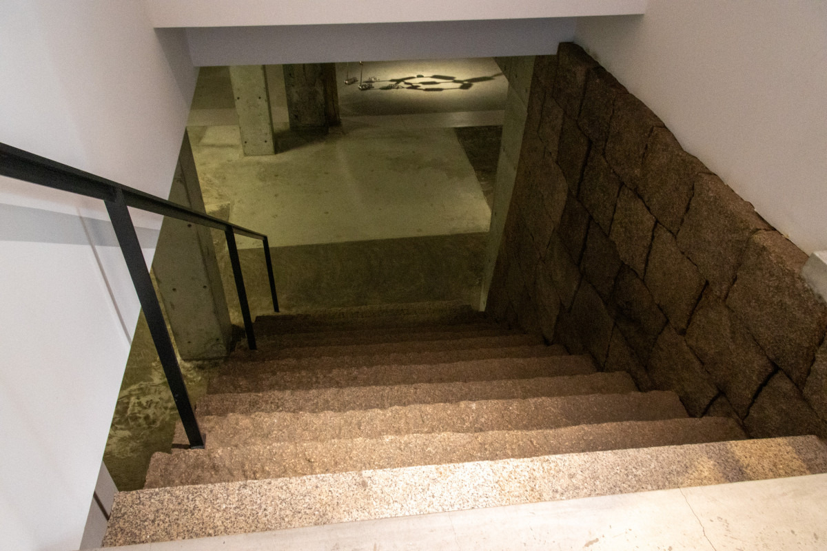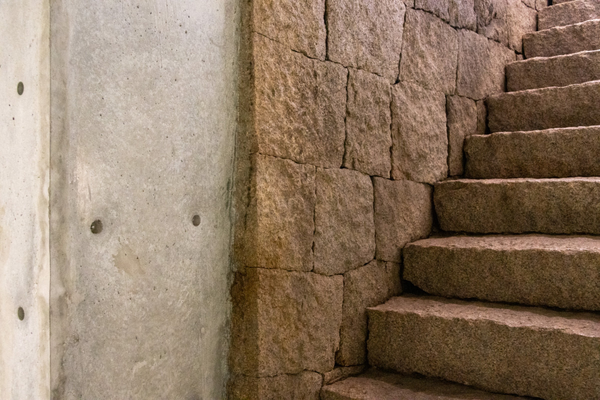エントランスの奥にある万成石(岡山市内で産出する淡紅色の花崗岩)で出来た石段を下った先にも地下展示室があります。