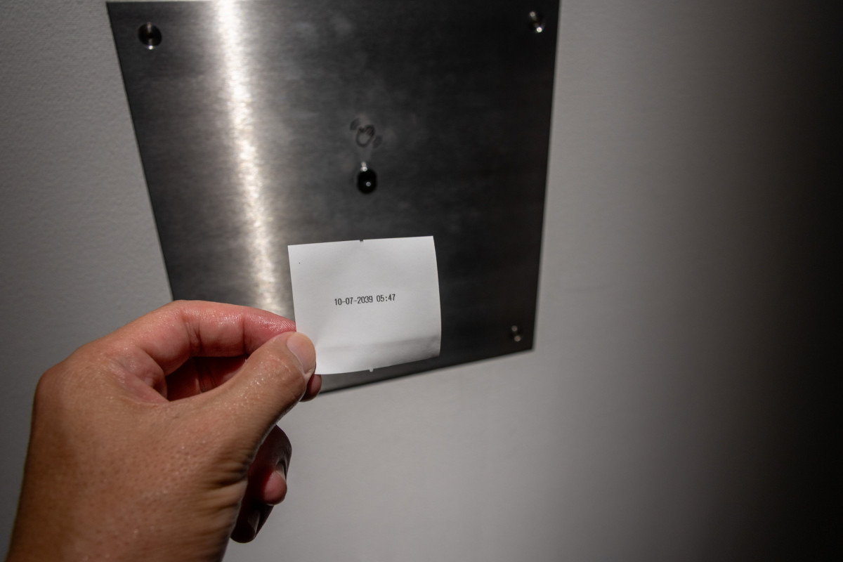 地下展示室に入ってすぐの右手にあるこちらの装置。壁面に設置された光電センサーに手をかざすと、最大25年先までのある時間の情報(日付と時間)がランダムに刻印された紙が出てきます。