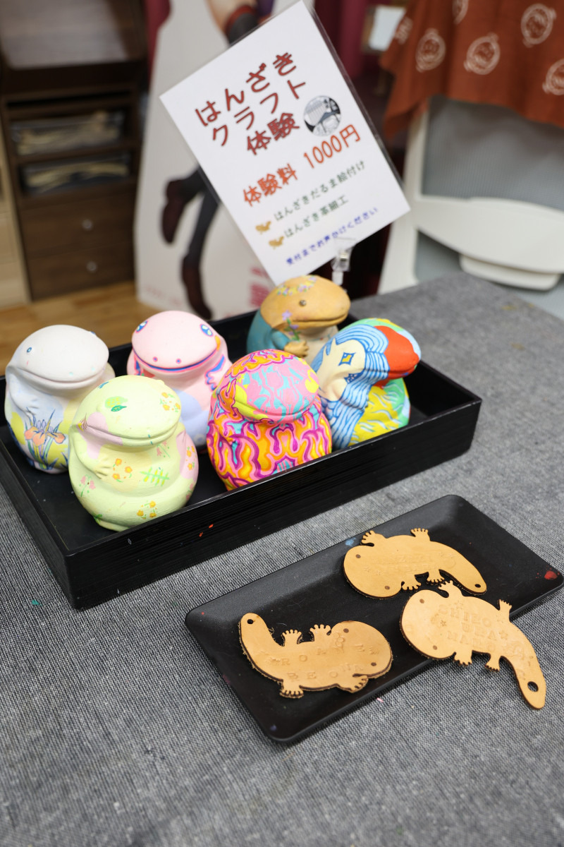 だるまの絵付け体験やキーホルダー革細工体験ができる「はんざきクラフト体験(1,000円)」も楽しめます。旅のお土産や思い出づくりにもおすすめです。