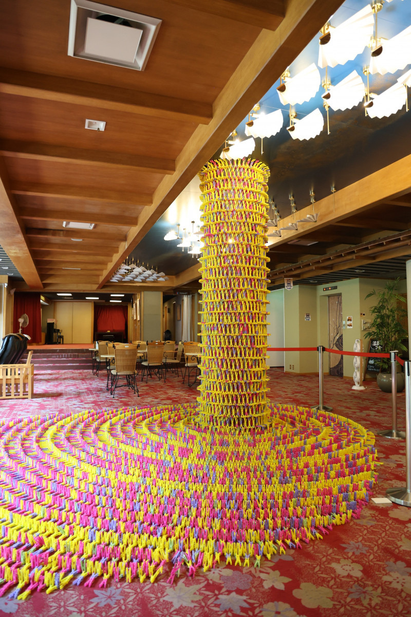 普段目にする物質や存在から役割を解放し、それらを組み合わせながら現代社会を再考する制作を研究されている高本敦基さんの作品です。よく見るとカラフルな洗濯ばさみが無数にあり、形を構成していました。身近な素材がこんなに素敵なアートになることに感心しました。ホテルの玄関ロビーフロアにお客様をお出迎えするように展示されています。