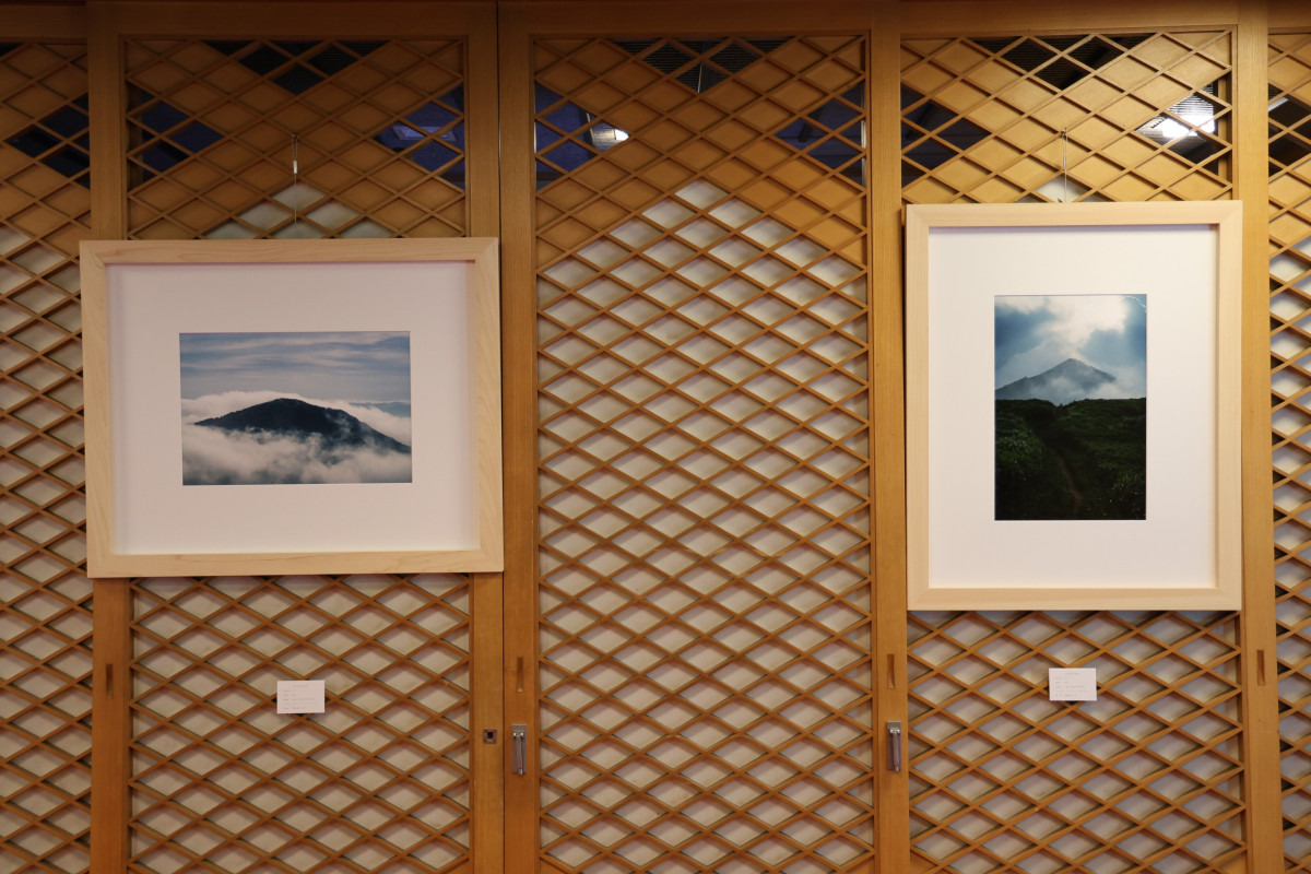 真庭市蒜山には「蒜山三座」と呼ばれる山々があり、三橋直人さんの作品の被写体になっています。三橋さんは撮影を行うタイミングにこだわり、晴れと曇りが混じる天候で、かつ気象の変化の大きい朝や夕方に蒜山三座に通われ、雄大な自然の神秘的な一瞬を切り取った写真が並んでいました。