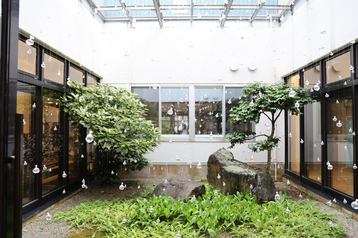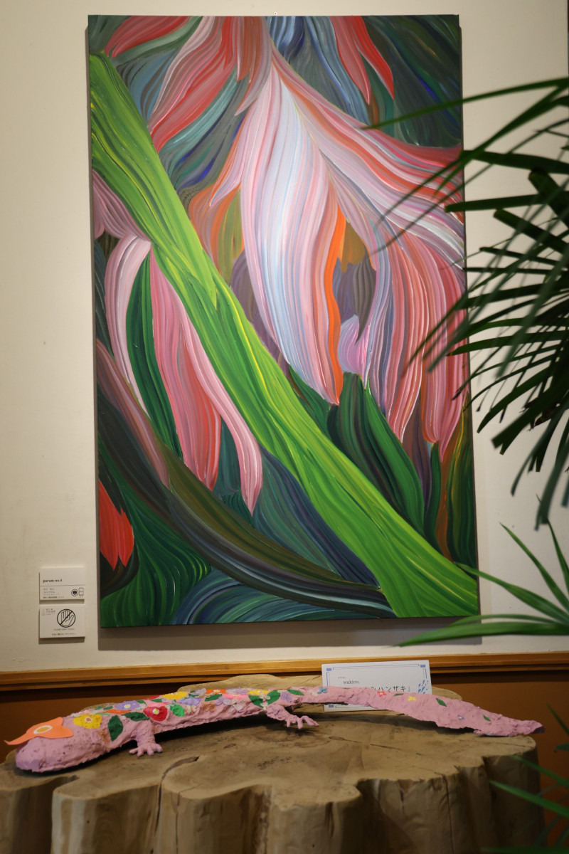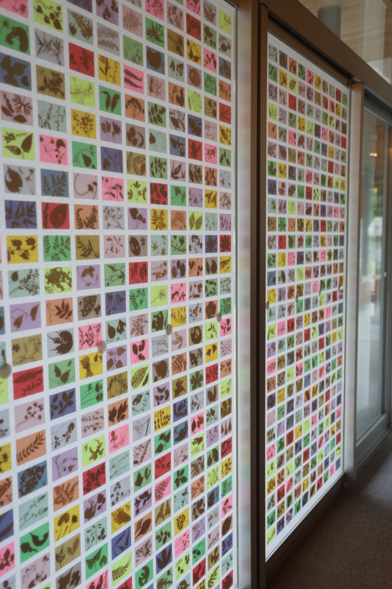 植物とマスキングテープで表現された、多様性と調和をテーマにしたアート作品です。フリースペースの壁面ガラス一面を使って展示されていました。