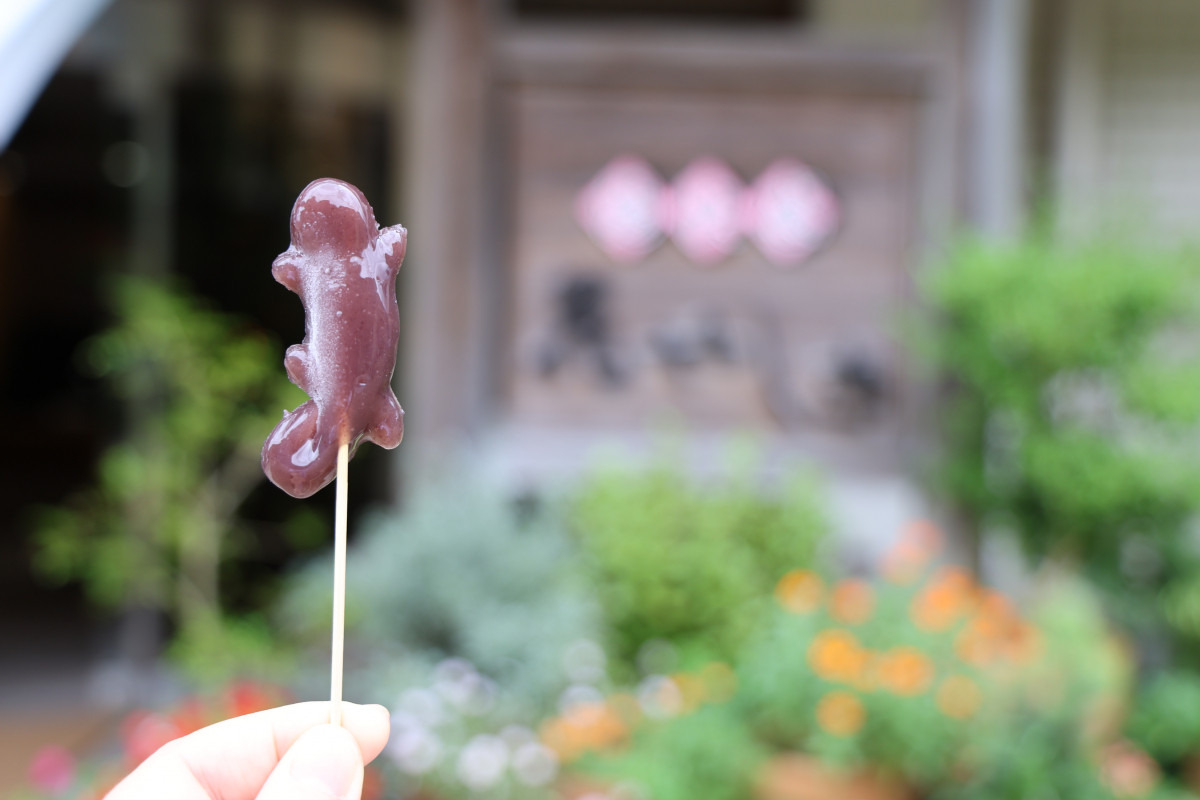 アットホームな雰囲気のお宿で、旭川に面した通りにあります。屋上には源泉かけ流しの露天風呂があり、自然をバックに清流の音を聞きながら温泉を楽しめます。内湯の他、日帰り利用もあり。「はんざき羊羹(200円)」のポスターに惹かれ買ってみることにしました。小指サイズの小さな羊羹は、湯原温泉のシンボルキャラクターはんざきの形をしています。はんざきとは、国の特別天然記念物のオオサンショウウオのことです。ホテルの女将が開発された羊羹で、こちらの他「下湯原温泉ひまわり館」でも買うことができます。冷凍のまま渡されますが、暑さであっという間に食べ頃になり、色つやよくなります。つるんと一口、程よい甘さで美味しかったです。