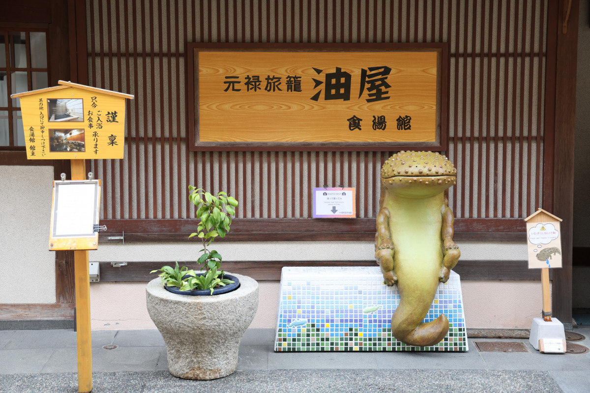 湯原温泉には、「はんざき」と呼ばれる国の天然記念物のオオサンショオウオをモチーフにした様々な作品があります。「元禄旅籠油屋」の入り口では、松岡徹さんの新作「はんざきさんと休憩中」がお客様を出迎えてくれています。