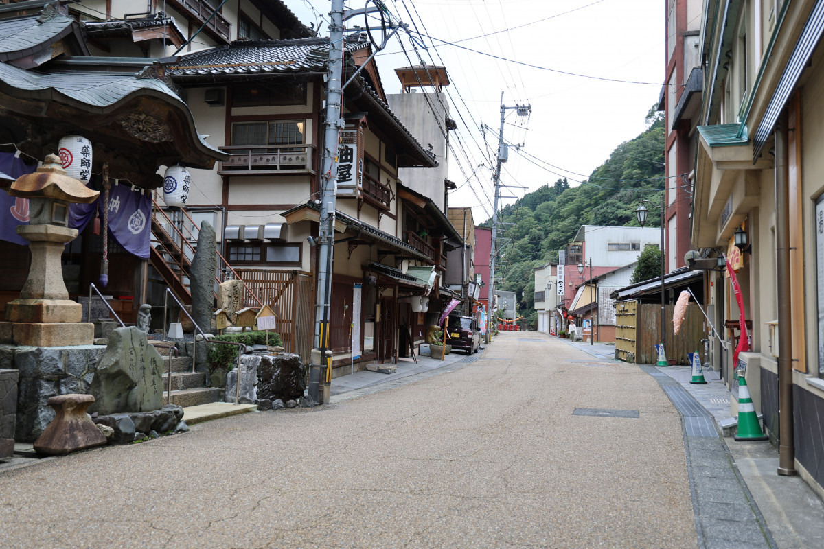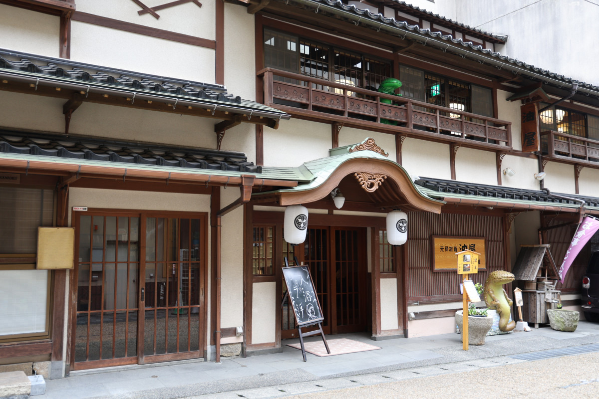元禄元年以来300年に渡る歴史あるお宿で、「千と千尋の神隠し」のモデルのひとつと言われています。新作の「はんざきさんと休憩中」と共に、前回開催時の展示作品の緑のはんざきアートが2階から温泉街を眺めていて、人気の撮影スポットになっています。露天風呂、大浴場、貸切風呂、日帰り温泉もできます。泉源が近いので、湧き出し直後の新鮮なお湯が楽しめます。
