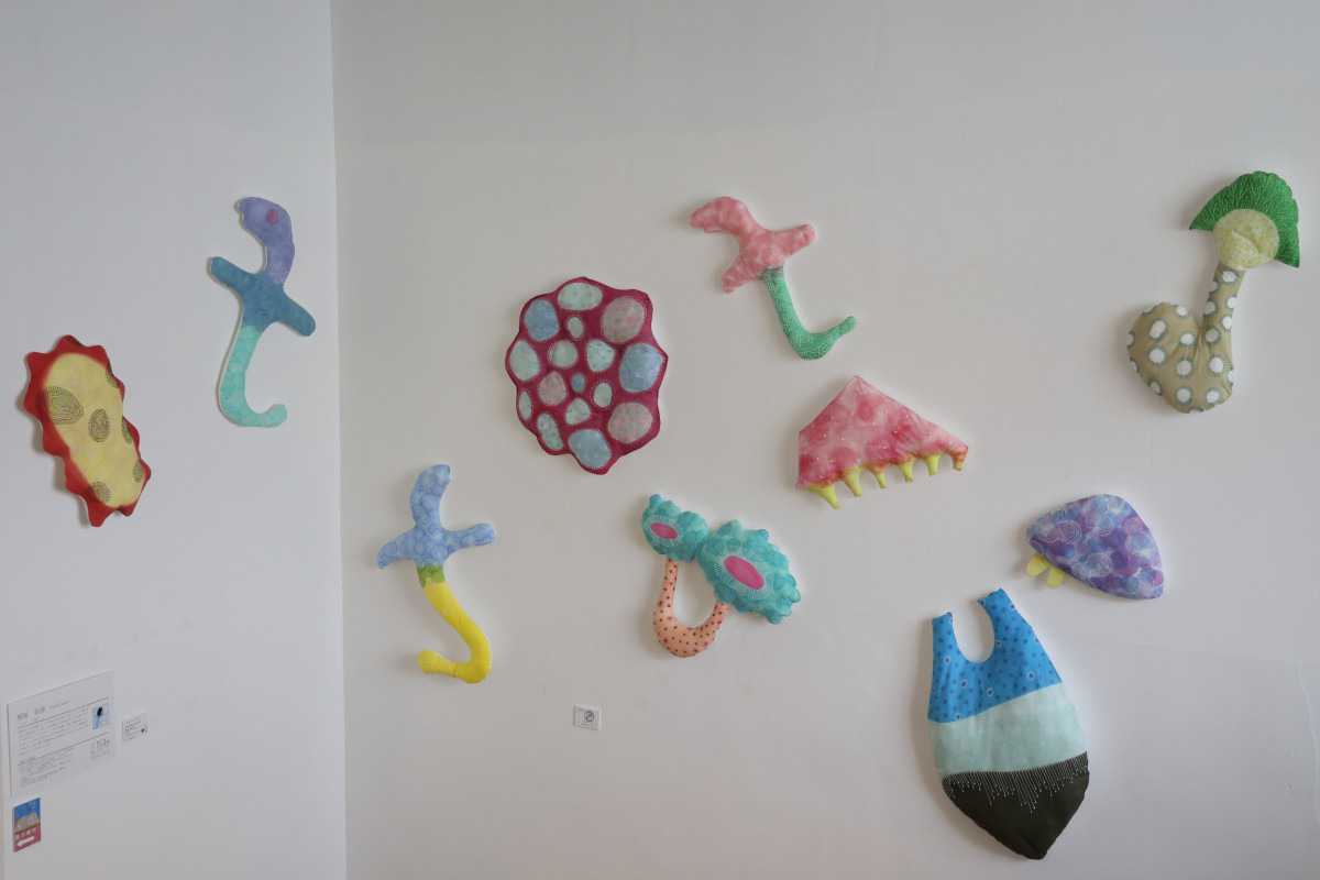宿の長い廊下を抜けた先にある階段の白い壁に、子供から大人まで親しみのもてるアートが展示されています。細胞の一つ一つを模様として生命の内側が表現されていて、人体の一部もアートになるとカラフルな生き物のようで生命感を感じました。