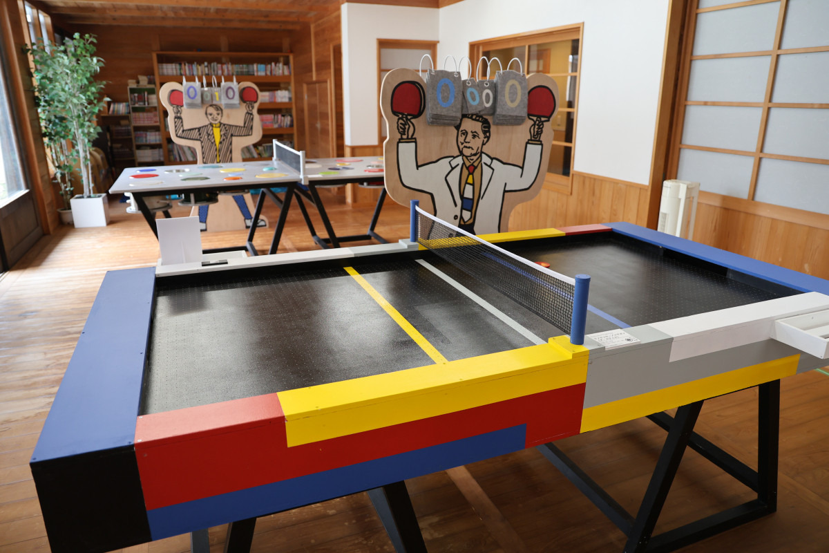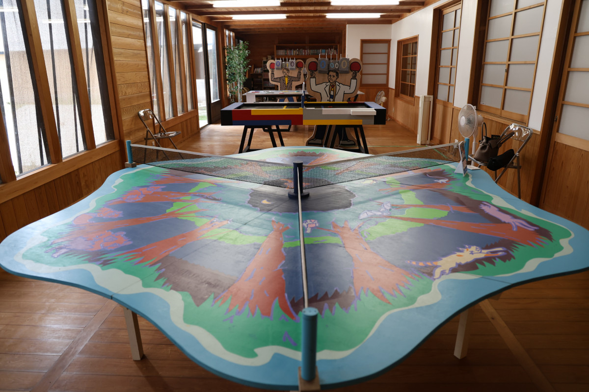 お宿のくつろぎスペースにカラフルで個性的な形の卓球台がありました。アーティストユニット「原倫太郎+原游」さんのアート作品です。見たことのない形で、遊び心をそそられました。30分300円で実際に遊ぶこともできます。