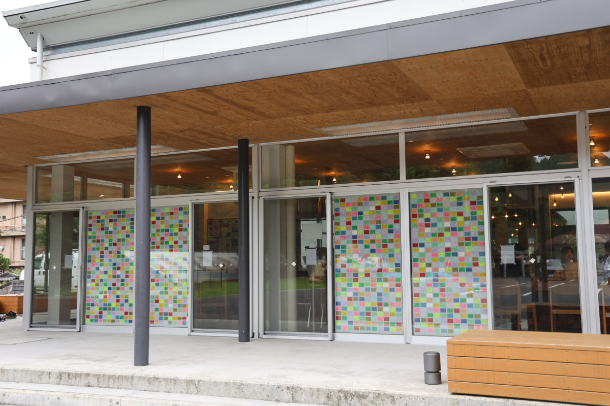 湯原振興局、湯原図書館、市民センター、湯原公民館の機能を有する複合施設で、住民や湯原を訪れる人が気軽に利用できるスペースがあります。入り口の扉に見えているのがアート作品です。