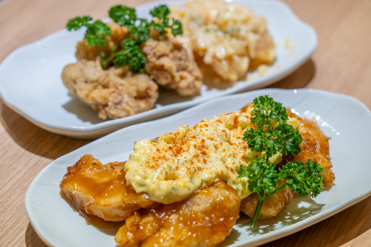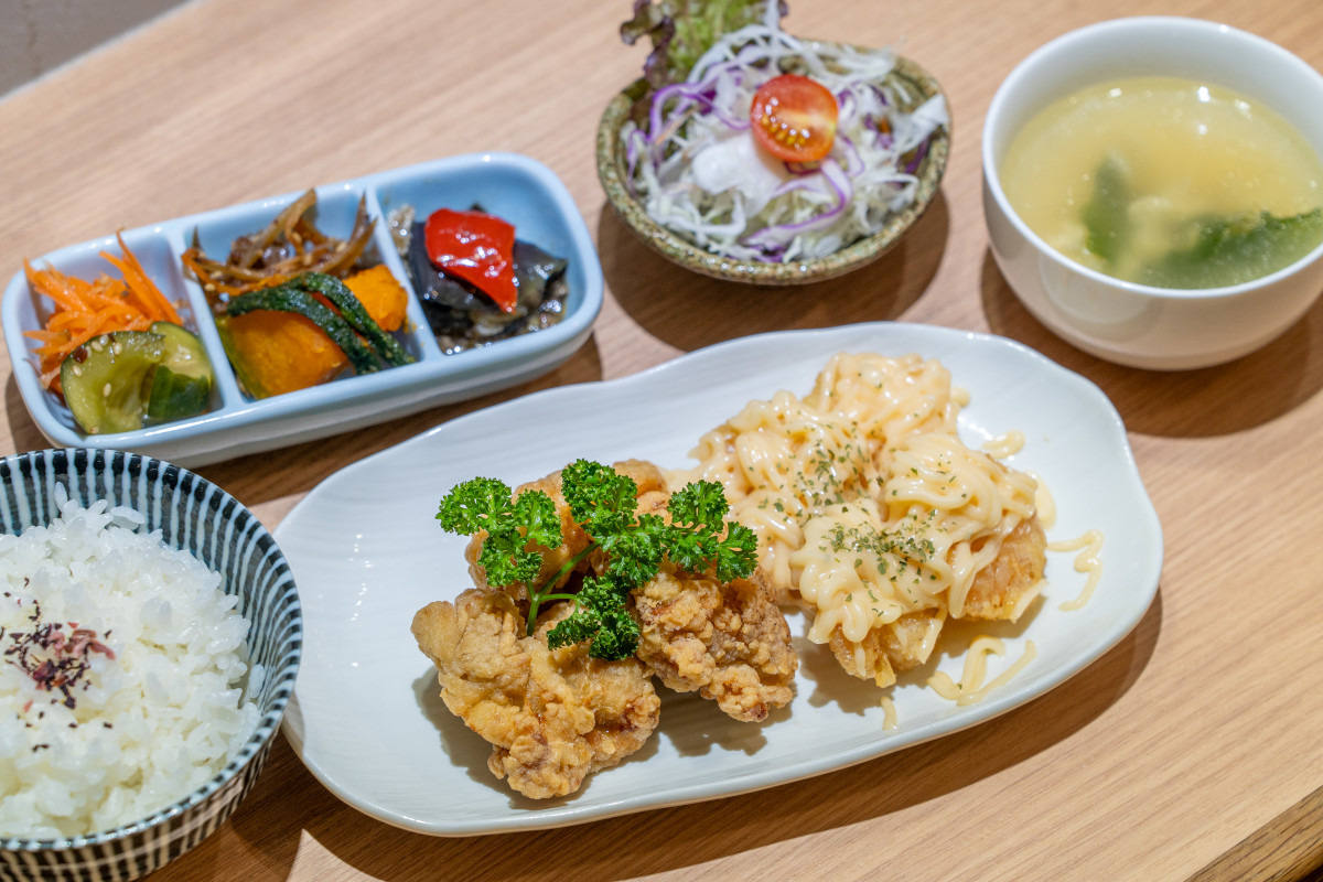 丁寧な仕込みと料理に合わせた自家製ソースが評判の「満天」。ランチはからあげ、エビマヨ、ロースカツ、チキン南蛮、ハニーマスタードチキンなどの中からメインを2種類選べます(1,200円)。写真はジューシーなからあげと、ぷりぷりのエビマヨのセット。自家製ドレッシングがかかったサラダに日替わりの副菜、ごはんにスープと、全て手作りのほっとできる味わいを求めて足を運ぶ人が多いのも頷けます。