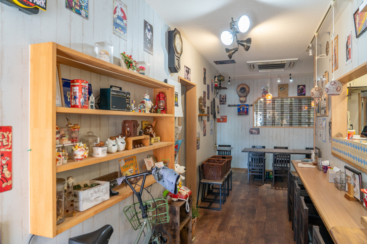 矢掛商店街の通りの中ほどに建つお店。カウンター席とテーブル席があるので、1人でも複数人でもシーンに応じて利用できます。店内には映画好きの店主が集めたポスターやグッズが飾られており、それらを見ているだけでもワクワク。料理が運ばれてくるまでの時間も楽しめます。