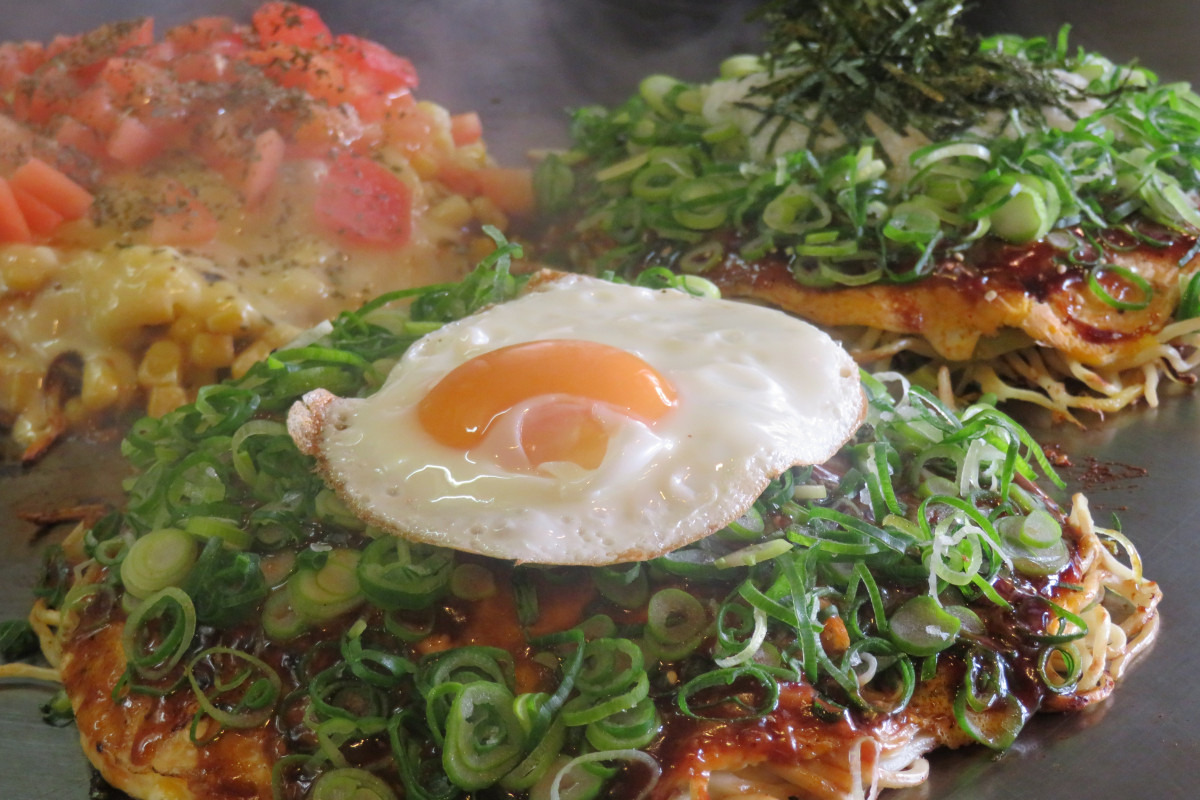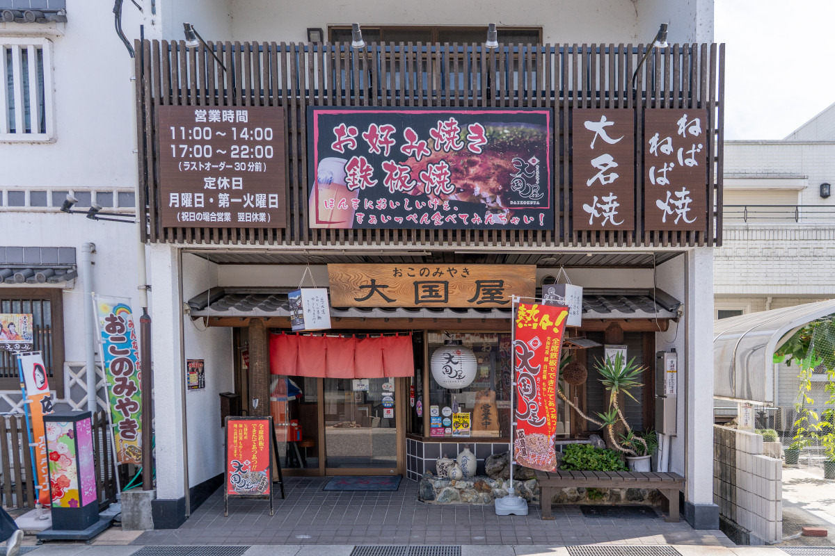 「道の駅 山陽道やかげ宿」からすぐ。「おこのみやき大国屋」は、地元矢掛産の麵や自然薯、もやしなどを使った広島お好み焼が人気の一軒。一番人気は、大葉、イカ天、ねぎ、目玉焼きが入った「大名焼」(1,265円)。メニュー名はもちろん宿場町である矢掛の大名行列にかけたものです。他にもエビ、イカ、タコ入りの「シーフード焼」や、納豆好きには堪らない「ねばねば焼」、トマト×チーズがイタリアンな「トマッチ―焼」など、個性的なメニューが揃っています。