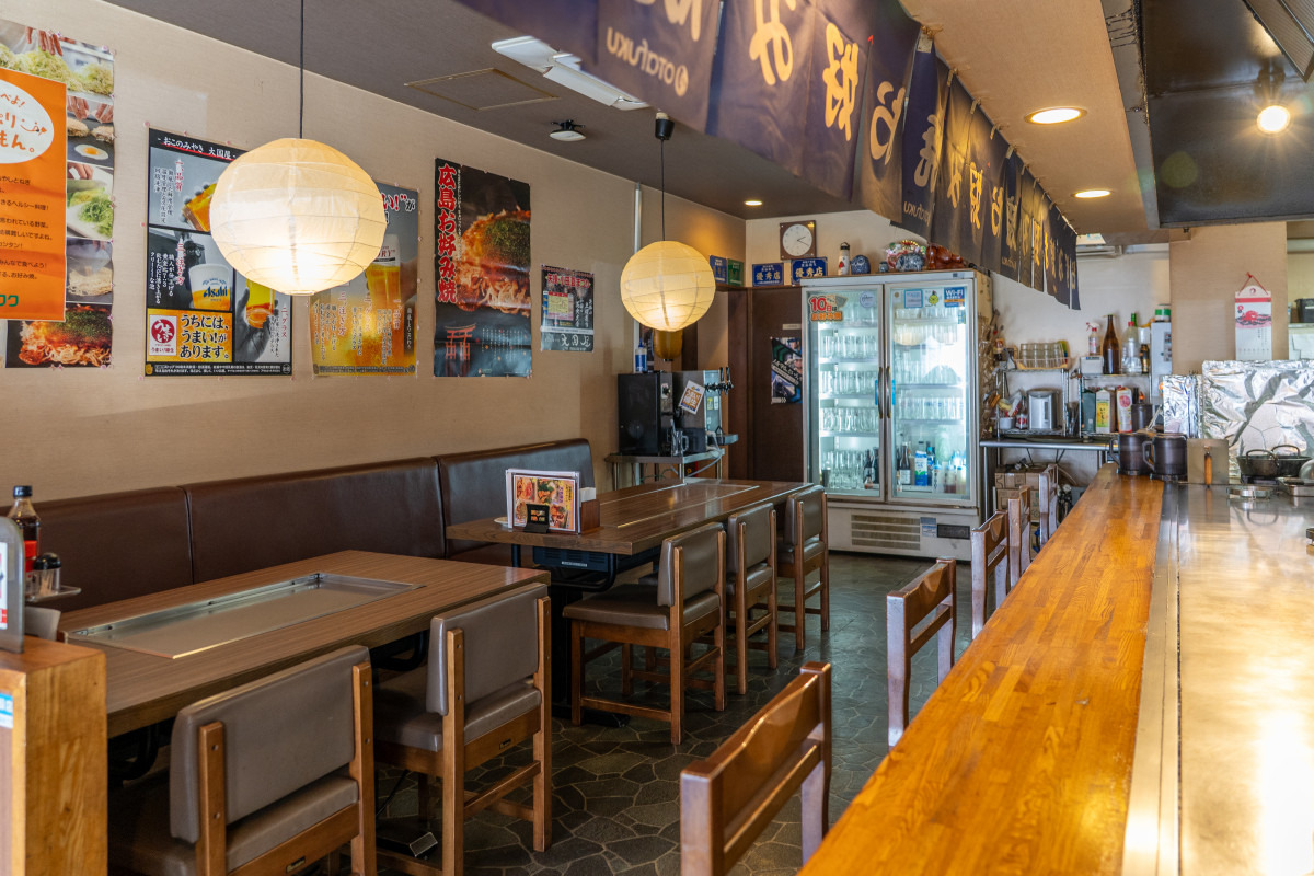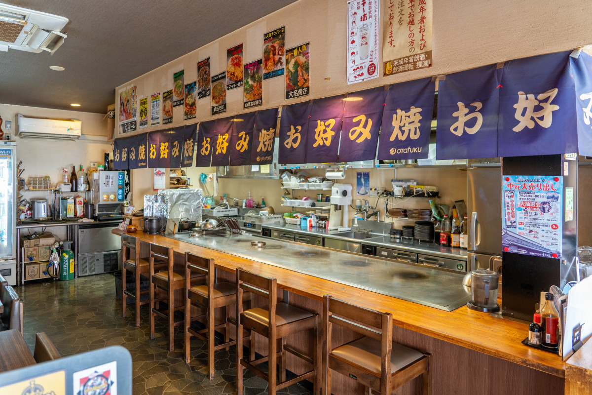 地元の人も観光客も気軽に立ち寄れる雰囲気。カウンター席は広い鉄板が目の前にあり、注文が入ってから1枚ずつ焼き上げられるお好み焼が、熱々の状態で提供されます。立ち上るソースの香りにも食欲がそそられる特等席!