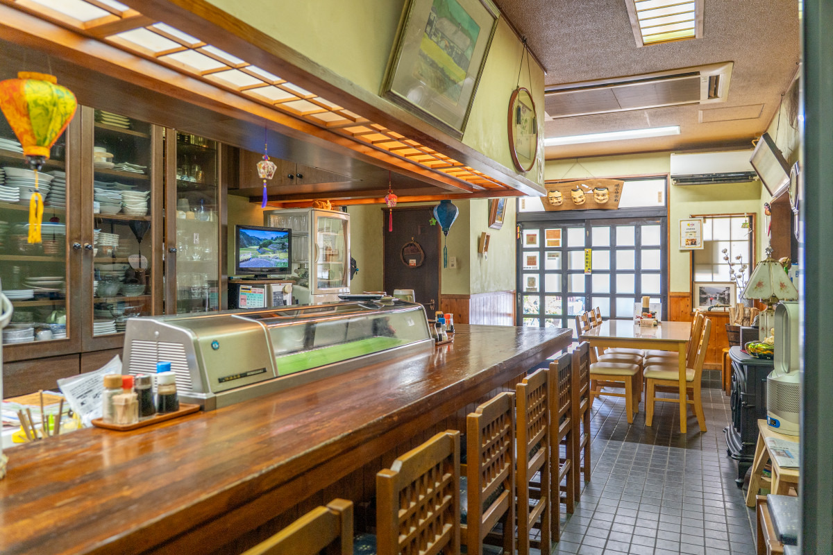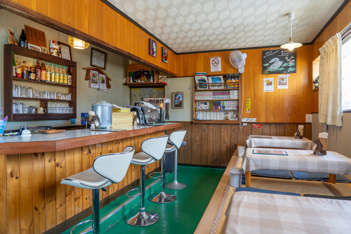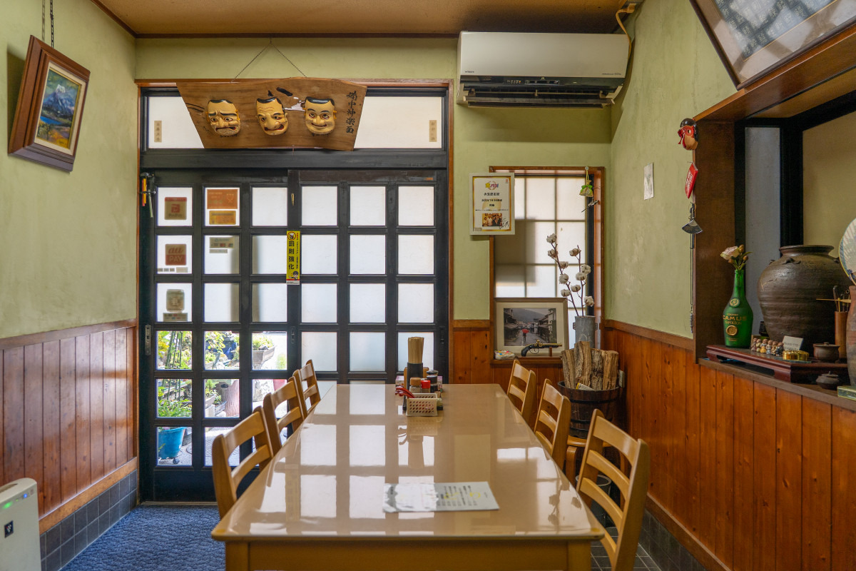 家族連れなどグループでの利用に嬉しいテーブル席も。口コミで評判が広がり、地元の人だけでなく町外からのファンも訪れます。旧宿場町の風情が残る町並みに溶け込む一軒なので、見逃さないよう気をつけて。
