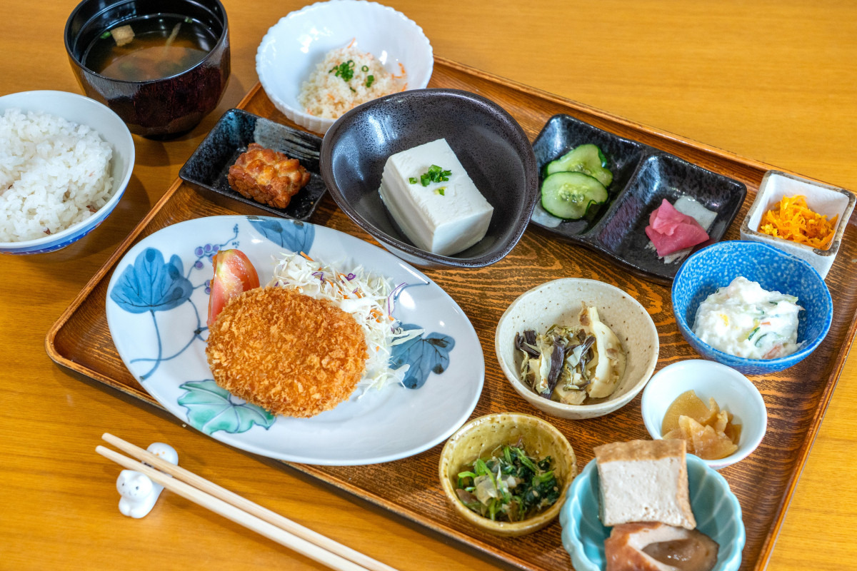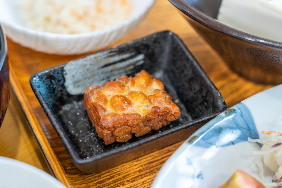 メインだけでなく、ごはん、味噌汁、さらに10種類にものぼる小鉢にも全てテンペが使用されています。なかでもテンペの素揚げはホクホクとした食感と大豆の芳ばしさが感じられ、クセになる美味しさです。ランチは他に、丼ものやラーメンなどのメニューもあります。