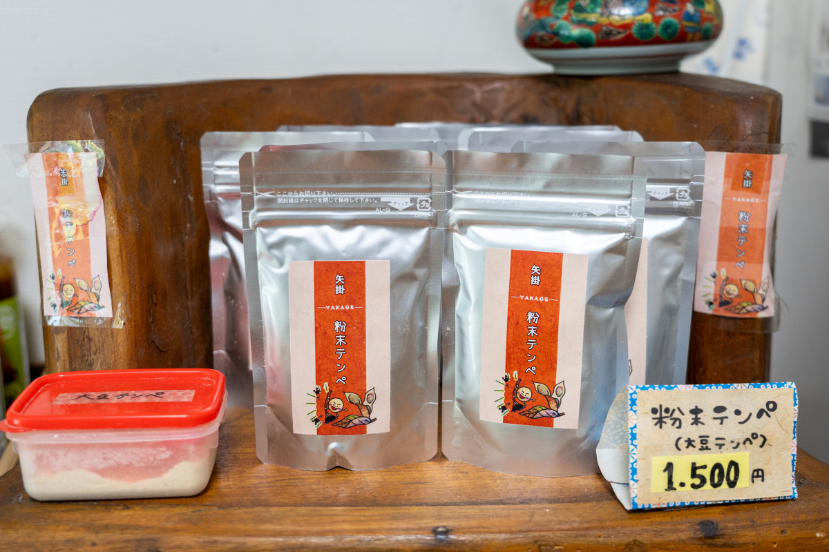 店にはテンペ製造所が併設しており、オリジナル商品も販売。粉末テンペはみそ汁やスープに混ぜたり、お米を炊く時に入れたり、手軽に使うことができます。地元のお店とコラボした、テンペ麩やテンペかりんとう等の商品もあり。