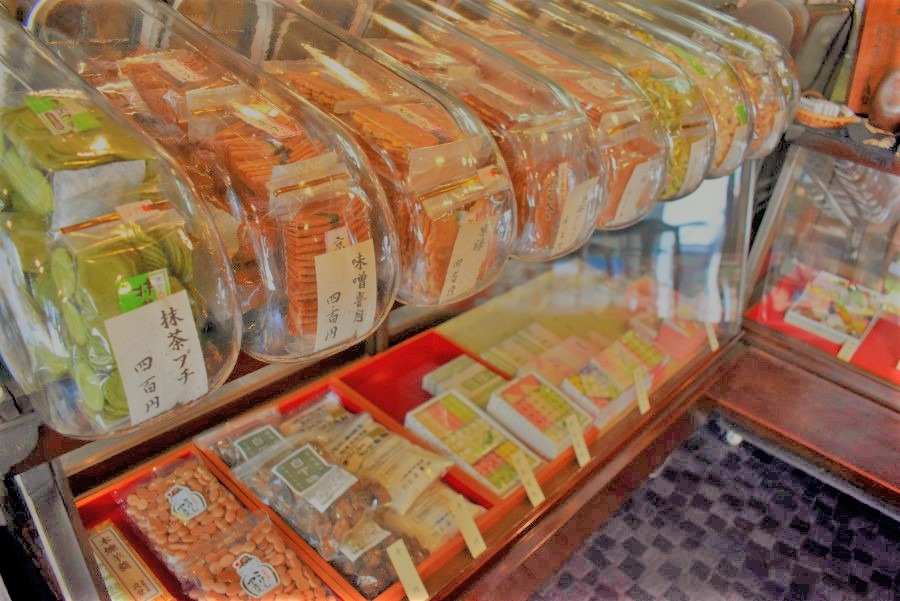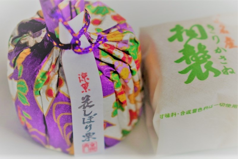 宝石のような透明感と色合いが目を引きます。102年のれんを守る「田中花正堂」には他にも、ピンクの箱に入ったかわいいクマのお汁粉やふくろうの最中など、見るだけでワクワクする品々が。