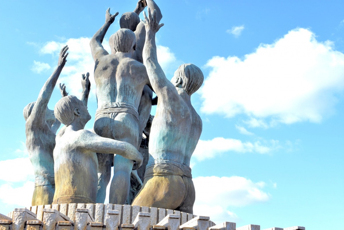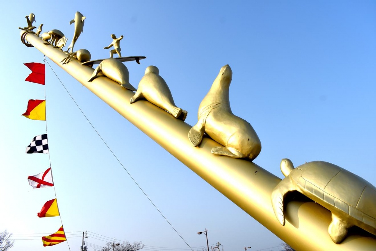 生き生きとした海獣たちが大歓迎。海に向かってまっすぐ伸びるオブジェに気分もすっきり爽やか!旅のはじまりを祝うファンファーレが聞こえてきそうです。