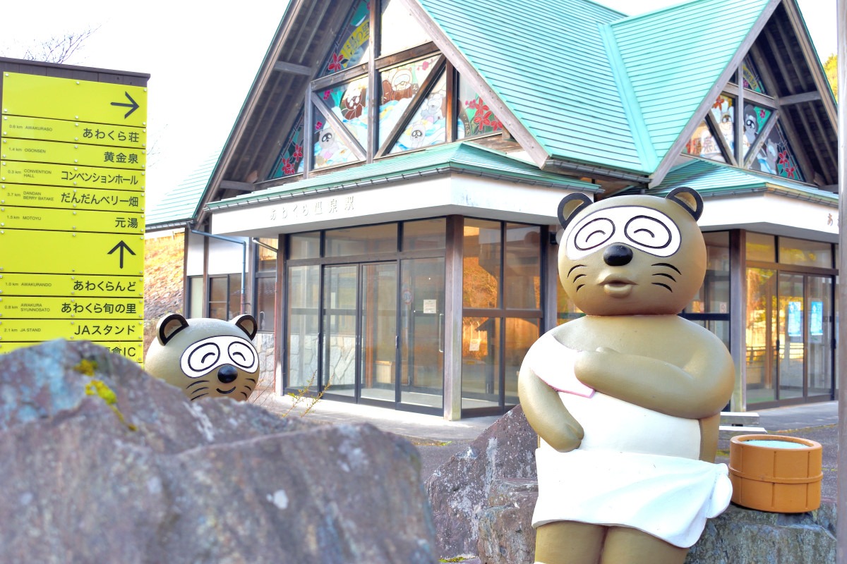 たぬきの傷が治ったという伝説のあるあわくら温泉。駅前からにっこにこ顔でタオル巻いちゃってます。たぬきに癒されたら、もちろん癒しの湯めぐりへ。たぬきお墨付きのいいお湯です。