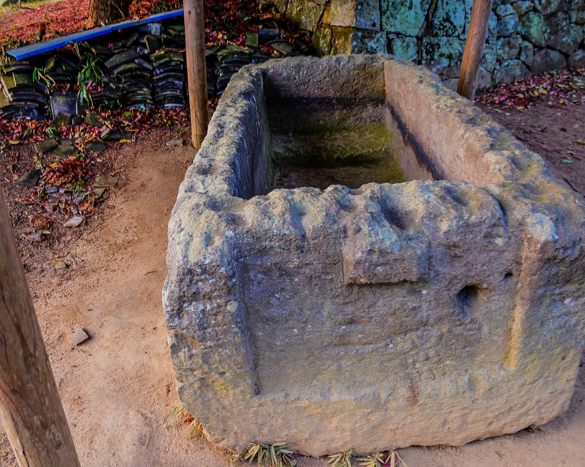荒神社の拝殿左側には石をくりぬいた石棺の身が置かれています。蓋は破片となっていますが、社の裏手に置かれています。身は長さが239センチメートル、最大幅が111センチメートル、高さ75センチメートル以上、内側は長さが193センチメートル、幅75センチメートル、深さ58センチメートルです。蓋の内面には赤色顔料が塗られており、小口側の面には直弧紋とみられる線刻が残っています。